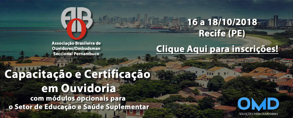 A Associação Brasileira de Ouvidores/Ombudsman – Seccional Pernambuco (ABO/PE) e a OMD Soluções para Ouvidorias promovem de 16 a 18 de outubro de 2018 o Curso de Capacitação, Certificação e Recertificação em Ouvidoria, em Recife/PE. O curso visa atender as necessidades apresentadas por profissionais atuantes em serviços de Ouvidoria de instituições públicas e privadas. Aborda, sobretudo, assuntos pertinentes ao dia a dia com o objetivo de preparar o Ouvidor e sua equipe para os desafios no desempenho desta função.